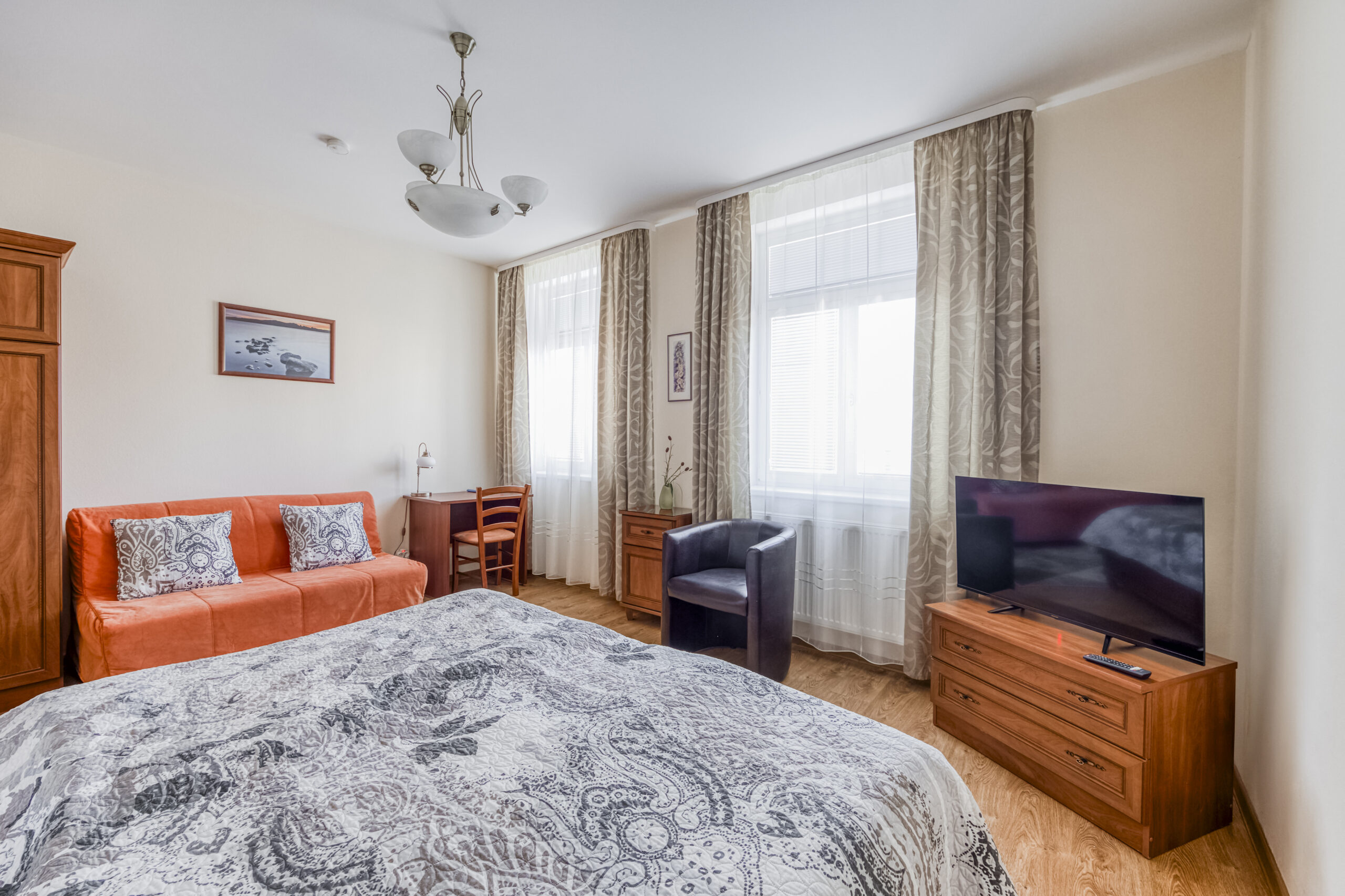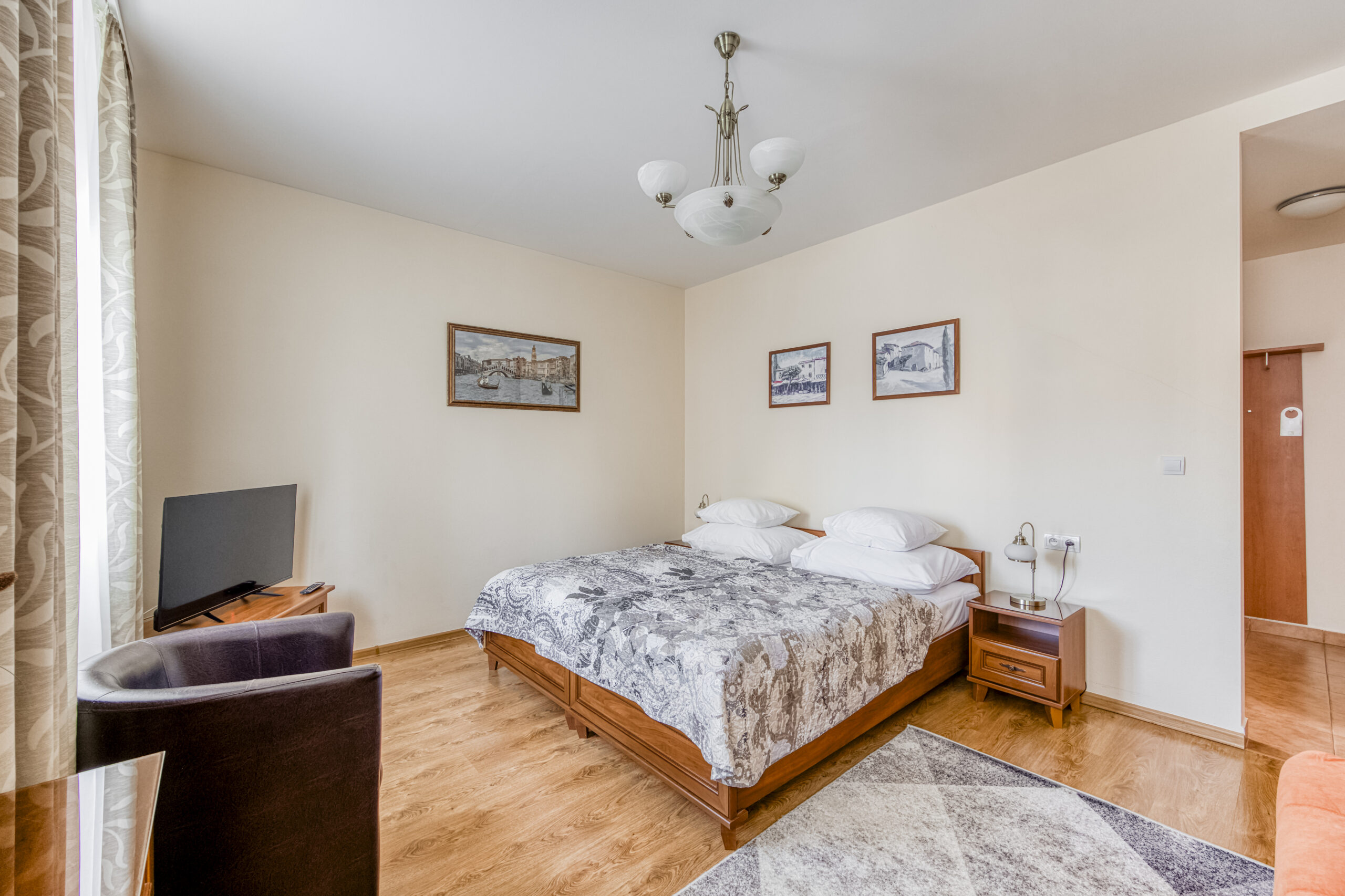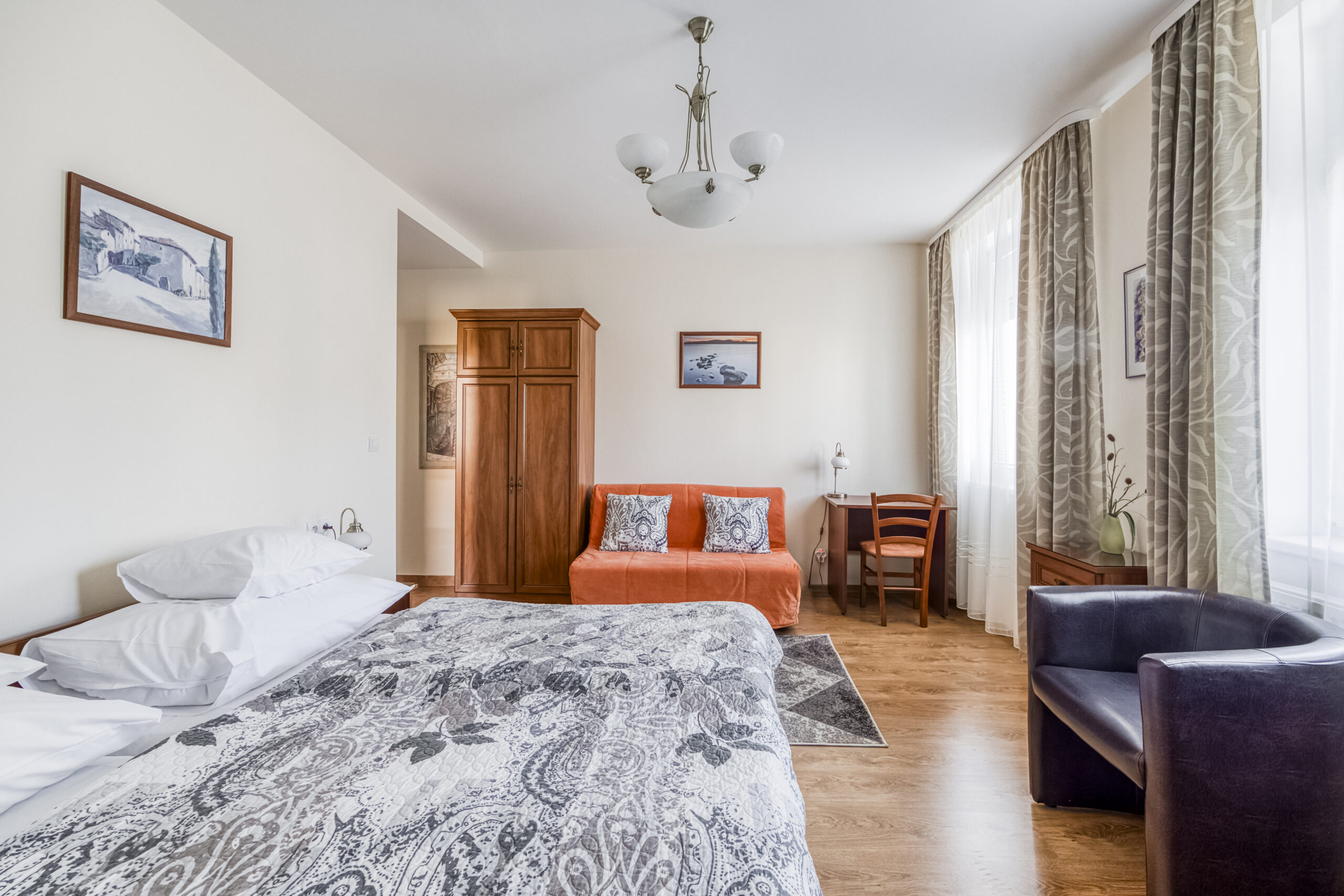 Pokoj Comfort Twin se nachází ve 1. patře hotelu a nabízí výhled do parku nebo na tichou ulici. Dvě samostatná lůžka poskytují hostům pohodlí, volnost a možnost přizpůsobit si pobyt podle vlastních potřeb. Klidná atmosféra pokoje a promyšlený interiér vytvářejí ideální prostor pro společný, ale nerušený odpočinek během pobytu v Mariánských Lázních.